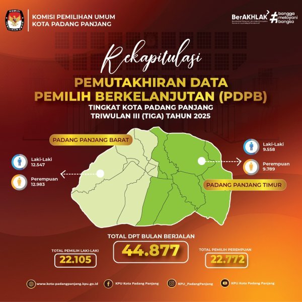 Padang Panjang #temanpemilih KPU Kota Padang Panjang melaksanakan Rapat Pleno Terbuka Pemutakhiran Data Pemilih Keberlanjutan Triwulan III (tiga) di Kantor KPU Kota Padang Panjang, Kamis, 2/10/ 2025. Rapat dibuka oleh Puliandri Ketua KPU Kota Padang Panjang didampingi oleh Armen, SH,, Dewi Aorora, SE., Gunawan, SP.,selaku Anggota KPU Kota Padang Panjang dan Ir. Lucky Dharma Yuli Putra, M.Si Sekretaris KPU Kota Padang Panjang. Rapat pleno ini di supervisi oleh Ory Sativa Syakban Anggota Provinsi Sumatera Barat dan didampingi Kepala Bagian (Kabag) Teknis Penyelenggaraan Pemilu dan Hukum KPU Sumbar, Sutrisno dan staf Sekretariat KPU Provinsi Sumatera Barat. Pembacaan tata tertib rapat pleno oleh Dewi Aorora, SE selaku divisi Hukum dan dilanjutkan pembacaan hasil pemutakhiran data pemilih berkelanjutan triwulan III (tiga) oleh Armen, SH selaku yang membidangi pemutakhiran data pemilih berkelanjutan. Rapat ini dihadiri oleh Bawaslu Kota Padang Panjang, Polres Padang Panjang, Kepala BPBD KesbangPol Kota Padang Panjang, Disdukcapil Kota Padang Panjang, Kantor Kementerian Agama Padang Panjang, Dinas Sosial Kota Padang Panjang, Sekretaris KPU Kota Padang Panjang dan Camat dan lurah se-Kota Padang Panjang. Dalam rapat tersebut, KPU Kota Padang Panjang menetapkan jumlah pemilih di Kota Padang Panjang sebanyak 44.877 pemilih dengan pemilih laki-laki sebanyak 22.105 pemilih dan pemilih perempuan sebanyak 22.772 pemilih. Jumlah pemilih sebanyak 44.877 pemilih tersebut dari Kecamatan Padang Panjang Timur sebanyak 19.347 Pemilih dengan rincian Laki-laki : 9.558 dan Perempuan : 9.789 pemilih. Sedangkan di Kecamatan Padang Panjang Barat sebanyak 25.530 Pemilih, dengan rincian Laki-laki : 12.457 dan Perempuan : 12.983 pemilih. ....