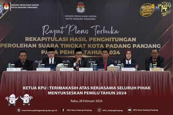 #Temanpemilih Pasca selesainya rekapitulasi penghitungan suara ditingkat kecamatan maka rekapitulasi penghitungan suara secara berjenjang sudah memasuki tahap akhir. Untuk itu, KPU kota Padang Panjang menggelar Rapat Pleno Terbuka Rekapitulasi Penghitungan Suara Pemilu Tahun 2024 Tingkat Kota Padang Panjang di Auditorium Mifan, Rabu (28/2). PJ. Walikota Padang Panjang, Sonny Budaya Putra dalam sambutannya memberikan apresiasi atas kinerja seluruh pihak yang terlibat dalam menyukseskan Pemilu tahun 2024 baik itu KPU dan Bawaslu beserta jajaran selaku penyelenggara maupun pihak keamanan yang telah mengamankan seluruh proses dari awal sampai akhir. “kita cukup berbangga, tingkat partisipasi pemilih di kota Padang Panjang termasuk partisipasi tertingi di Sumbar yakni mencapai 84%. Angka ini melebihi target partisipasi nasional sebagaimana komitmen kita bersama” ungkapnya. Ditambahkannya, di kota Padang Panjang tidak terjadi hal-hal yang tidak diinginkan seperti kerusuhan, pertikaian ataupun gangguan keamanan lainnya. “ini menunjukkan bahwa kita berhasil mewujudkan demokrasi yang sehat tanpa adanya perpecahan meskipun berbeda pilihan, semoga pasca Pemilu ini kita kembali merajut kebersamaan dengan kehadiran pemimpin terpilih” ucapnya. Sementara itu, Ketua KPU kota Padang Panjang, Puliandri saat membuka secara resmi menyampaikan kita telah menyelenggarakan Pemilu serentak tahun 2024 tahap demi tahap hingga sampai pada rapat pleno rekapitulasi hasil penghitungan suara tingkat kota. “keberhasilan Pemilu hingga ditahap ini berkat kerjasama kita bersama, terimakasih kepada KPU, PPK, PPS, KPPS, Petugas Ketertiban, Bawaslu dan jajaran personil pengamanan yang telah berjibaku menyukseskan Pemilu sehingga dapat berjalan aman dan sebagaimana mestinya” ujar Puliandri. KPU kota Padang Panjang turut mengucapkan terimakasih kepada Pemerintah Daerah dan jajaran Forkopimda atas dukungan dan fasilitasinya kepada penyelenggara. Turut hadir Ketua DPRD, Mardiansyah., Kapolres Padang Panjang, AKBP Kartyana Wiyarso Wardoyo Putro., Ketua Pengadilan Negeri, Agung Wicaksono., Ketua Bawaslu, Hidayatul Fajri., Kejaksaan Padang Panjang, Rutan Kelas IIB Padang Panjang, Camat dan Lurah se Kota Padang Panjang, BPBD Kesbangpol, Dinas Kominfo, Dinas Kesehatan, Disdukcapil, Dinas Perhubungan beserta undangan lainnya. (rts) #KPUMelayani #PemiluSerentak2024