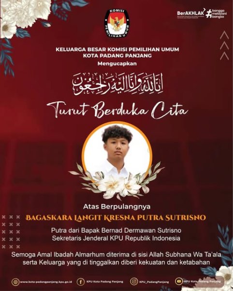 Keluarga Besar KPU Kota Padang Panjang menyampaikan turut berduka cita yang sedalam-dalamnya atas berpulangnya ananda Bagaskara Langit Kresna Putra Sutrisno, putra dari Bapak Bernad Dermawan Sutrisno, Sekretaris Jenderal KPU Republik Indonesia.