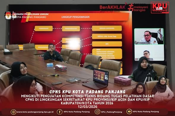 Padang Panjang – Komisi Pemilihan Umum (KPU) Kota Padang Panjang hingga 13 Maret 2026 masih aktif mengikuti kegiatan Penguatan Kompetensi Teknis Bidang Tugas (PKTBT) Pelatihan Dasar CPNS di lingkungan Sekretariat KPU Provinsi/KIP Aceh dan KPU/KIP Kabupaten/Kota Tahun 2026. Gelombang pelatihan kali ini diikuti secara daring dari Aula Nova Indra, Kantor KPU Kota Padang Panjang, sejak Selasa (10/03/2026).