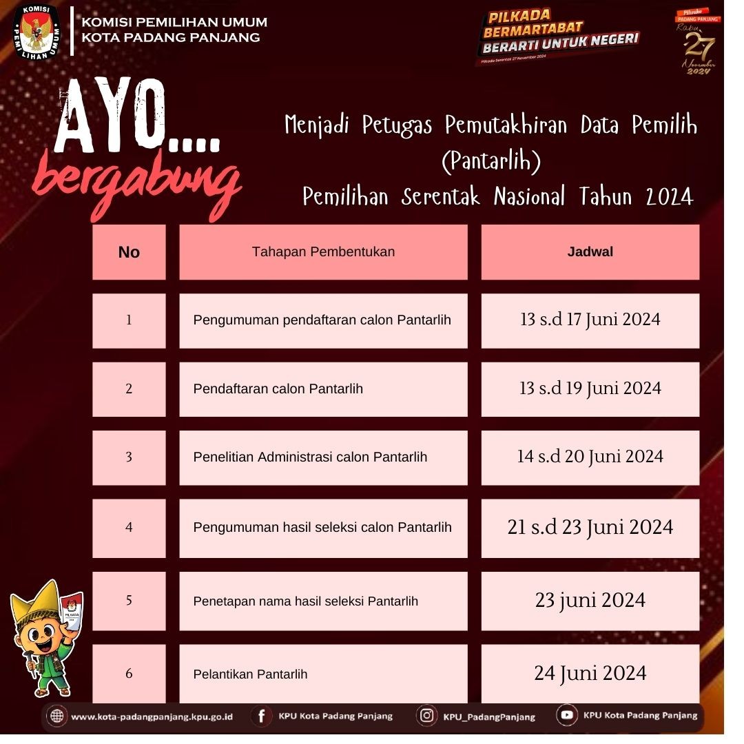 #TemanPemilih, Ayoo bergabung menjadi Petugas Pemutakhiran Data Pemilih (Pantarlih) Pemilihan Serentak Nasional Tahun 2024. Kepoin jadwalnya disini.