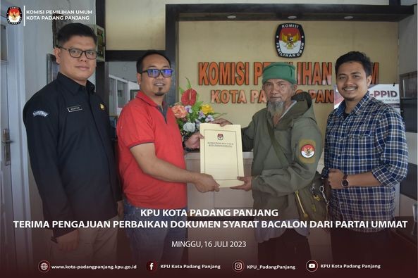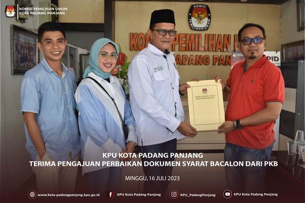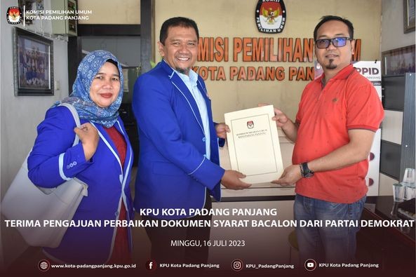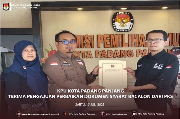 Partai Keadilan Sejahtera (PKS) mengajukan kembali perbaikan dokumen syarat bakal calon ke KPU Kota Padang Panjang, Sabtu (15/7) dan diterima langsung oleh Ketua Divisi Teknis dan Penyelenggaraan KPU Kota Padang Panjang, Harry Hazari. (rts)