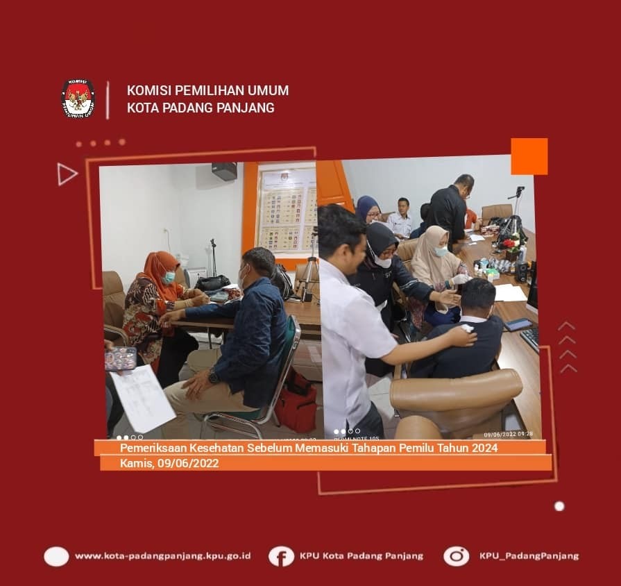 Sehubungan dengan dengan semakin dekatnya akan memasuki tahapan penyelenggaraan Pemilu Serentak tahun 2024, KPU kota Padang Panjang melaksanakan pemeriksaan kesehatan bagi Komisioner KPU dan Sekretariat KPU di Aula Nova Indra Kantor KPU Kota Padang Panjang, kamis, 09/06/2022.