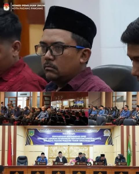 Padang Panjang, #TemanPemilih. Komisi Pemilihan Umum Kota Padang Panjang menghadiri Sidang Paripurna Penyampaian Rekomendasi atas Laporan Keterangan Pertanggungjawaban (LKPj) Wali Kota.Tahun Anggaran 2024, Kamis (17/4/2025) di Ruang Sidang DPRD.