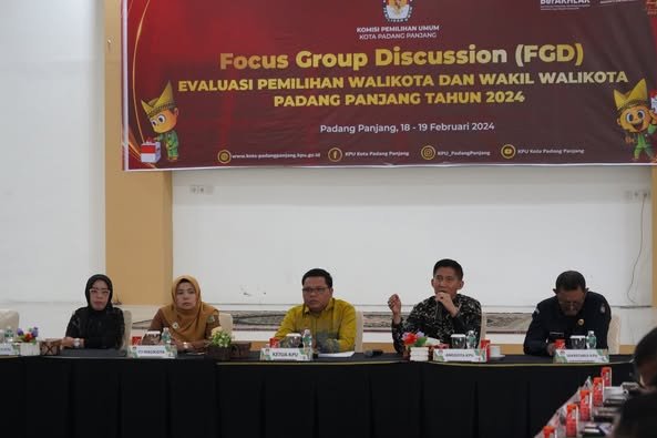 Padang Panjang. #Temanpemilih, Komisi Pemilihan Umum (KPU) Kota Padang Panjang gelar focus group discussion (FGD) evaluasi pelaksanaan pemilihan serentak tahun 2024 di Auditorium II Mifan Waterpark dari tanggal 18-19/02/2025. Focus group discussion (FGD) evaluasi pelaksanaan pemilihan serentak tahun 2024 di Kota Padang Panjang dihadiri oleh Ketua dan anggota KPU Kota Padang Panjang, Pj Walikota Padang Panjang atau yang mewakili, Muspida Kota Padang Panjang, OPD, Sekretaris KPU Kota Padang Panjang, Ketua dan Anggota Bawaslu Kota Padang Panjang, Instansi terkait, LO Paslon peserta pemilihan tahun 2024, Ketua PPK dan PPS se Kota Padang Panjang dan Sekretariat KPU Kota Padang Panjang. Focus group discussion (FGD) evaluasi pelaksanaan pemilihan serentak tahun 2024 dibuka oleh Ketua KPU Padang Panjang Puliandri Ketua KPU Kota Padang Panjang. Dalam sambutannya menyampaikan apresiasi kepada Pemerintah Kota beserta jajarannya, instansi terkait, serta TNI dan Polri, Bawaslu Kota Padang Panjang, PPK dan PPK beserta jajarannya dan beserta peserta pemilihan tahun 2024, Media/pers yang telah bersama-sama menyukseskan pemilihan tahun 2024 di Kota Padang Panjang. KPU Kota Padang Panjang telah berupaya melaksanakan tahapan dilaksanakan sesuai dengan ketentuan peraturan yang berlaku. Jikapun muncul gugatan di Mahkamah Konstitusi telah diputus sebagaimana mestinya. Selanjutnya Pemerintahan Kota Padang Panjang melalui Staf Ahli Bidang Pemerintahan, Hukum dan Politik Setdako, Nofiyanti, S.STP, MM menyampaikan terima kasih kepada KPU, Bawaslu, Peserta Pemilihan Serentak Tahun 2024, PPK, PPS, KPPS, Pers/media, instansi terkait serta masyarakat Kota Padang Panjang atas telah menyukseskan pelaksanaan pemilihan serentak di Kota Padang Panjang. Semoga kesadaran akan pentingnya memilih semakin meningkat. Agar terarah dan tercapainya maksud dan tujuan kegiatan tersebut, KPU Kota Padang Panjang menghadirkan narasumber. Dengan adanya narasumber tersebut diharapakan semua peserta turut memberikan masukan dan saran untuk menjadi bahan pertimbangan untuk memperbaiki kualitas demokrasi dimasa yang akan datang yang lebih baik serta untuk meningkatkan partisipasi masyarakat.