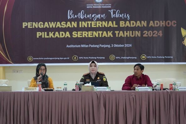 Padang Panjang, #Temanpemilih, Komisi pemilihan Umum (KPU) Kota Padang Panjang gelar bimbingan teknis pengawasan internal badan AdHoc Pilkada Serentak Tahun 2024 Pemilihan Gubernur dan Wakil Gubernur Provinsi Sumatera Barat dan Pemilihan Walikota dan Wakil Walikota Padang Panjang Tahun 2024. Kegiatan tersebut dilaksanakan di Auditorium II Mifan Waterpark, Kamis, 03/10/2024. Bimbingan teknis dibuka oleh Puliandri Ketua KPU Kota Padang Panjang didampingi Anggota KPU Kota Padang Panjang, Sekretaris KPU Kota Padang Panjang dan dihadiri oleh Kejari Kota Padang Panjang, Polres Padang Panjang, Dinas Kominfo Padang Panjang, Pejabat Struktural, Pejabat Fungsional, Staf Sekretariat KPU Kota Padang Panjang, Ketua dan Anggota PPK se Kota Padang Panjang, Sekretaris PPK dan Staf Sekretariat PPK, Ketua PPS dan Anggota PPS, Sekretaris PPS dan Staf Sekretariat PPS. Dalam sambutannya Puliandri Ketua KPU Kota Padang Panjang mengucapkan selamat atas prestasi yang diraih oleh PPK Padang Panjang Timur sebagai juara 1 favorit atas Konten Sosialisasi Kreatif Pilkada Bermartabat Tahun 2024 yang peanugrahannya pada rapat konsolidasi badan Ad Hoc pemilihan serentak nasional tahun 2024 yang dilaksanakan di Padang pada tanggal 1 s.d 2 Oktober 2024. Dalam bimbingan teknis pengawasan ini ada hal - hal penting yang akan disampaikan narasumber nantinya. Diharapkan dapat mengikutinya hingga sampai berakhir nantinya. Kegiatan ini sebagai bentuk ajang evaluasi bagi KPU kota Padang Panjang ke Badan AdHoc untuk kebaikan kinerja kita depannya. Kegiatan ini menghadirkan narasumber dari Kepala Kejaksaaan Negeri (Kajari), Jerniaty, MH tentang penegakan hukum dalam pilkada terkait dan sanksi - sanksi hukum perdata dan sanksi hukum pidana jika terjadi pelanggaran dan dilanjutkan narasumber dari akademisi, Dr. Fitra Mulyawan, MH tentang potensi-potensi masalah hukum yang terjadi pada internal penyelenggara. Pembedahan materi pengawasan oleh Anggota KPU Kota Padang Panjang oleh Dewi Aorora, SE dari segi hukum, Masnaidi B, S,Kom, M.AP dari segi Kode Etik dan Gunawan dilihat dari pelaksanaan teknis pemilu.