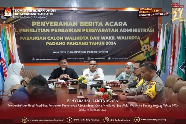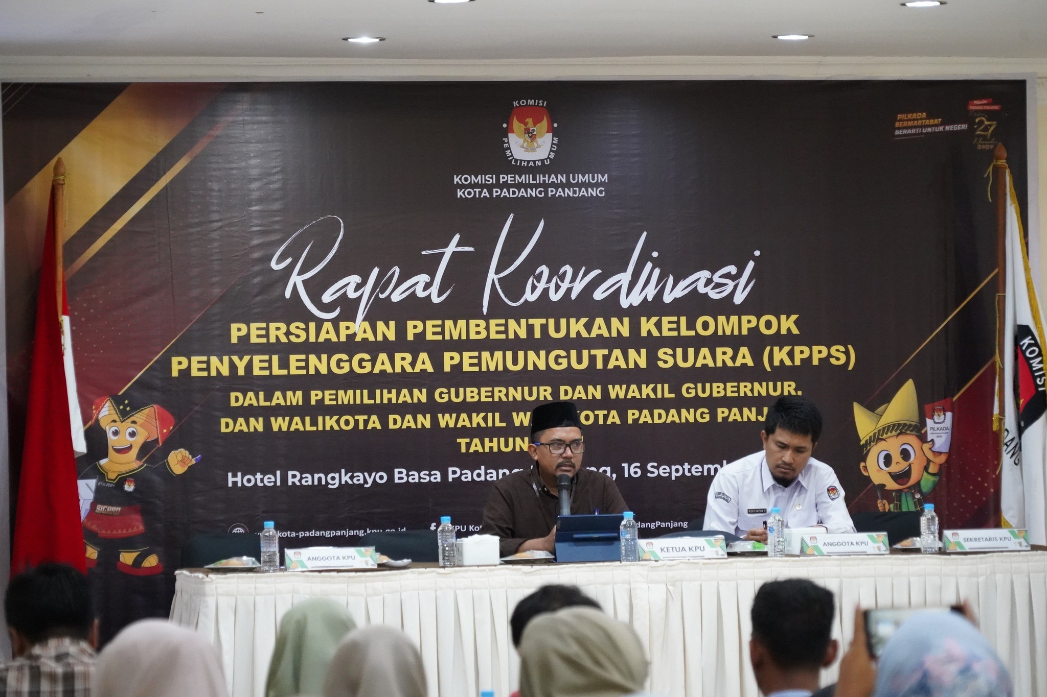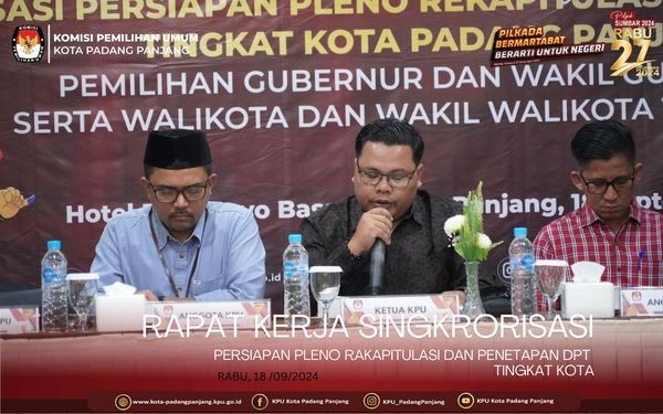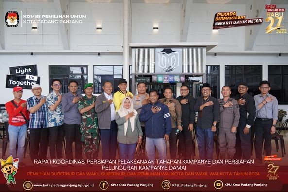 Padang Panjang. Komisi Pemilihan Umum (KPU) Kota Padang Panjang gelar rapat koordinasi (rakor) persiapan deklarasi kampanye damai untuk Pemilihan Walikota dan Wakil Walikota Padang Panjang yang dilaksanakan di Manyala Cafe, Kamis, 19/09/2024. Rapat koordinasi yang dibuka oleh Gunawan Divisi Teknis penyelenggara pemilu KPU Kota Padang Panjang didampingi Masnaidi B, S,Kom, M,AP Divisi Sosdiklih dan SDM KPU KOta Padang Panjang. Rakor dihadiri Dandim 0307 Kabupaten Tanah Datar, Polres Padang Panjang, Kejaksaan Negeri Padang Panjang, Bawaslu Padang Panjang, BPBD Kesbangpol Padang Panjang, Dishub Padang Panjang, Diskominfo Padang Panjang, Dispora Padang Panjang, LO Bakal Paslon Walikota dan Wakil Walikota Padang Panjang, Insan pers, Plh. Sekretaris KPU Padang Panjang, Pejabat Struktural dan Fungsional KPU Kota Padang Panjang dan staf pelaksana Sekretariat KPU Kota Padang Panjang. Dalam sambutan pembukaan rapat, Gunawan, SP menyampaikan sebelum akan dimulai tahapan kampanye . Sebelum itu, KPU akan menetapkan rangkaian tahapan, termasuk penetapan pasangan calon dan pengundian nomor urut. Selama masa pengumuman penerimaan masa masukan tanggapan masyarakat atas hasil penelitian persyaratan administrasi bakal pasangan calon Walikota dan Wakil Walikota Padang Panjang, KPU Kota Padang Panjang tidak ada menerima masukan tanggapan masyarakat atas hasil penelitian persyaratan administrasi ujar Gunawan. Selanjutnya rapat dipimpin oleh Masnaidi dalam arahannya menyampaikan tentang deklarasi kampanye damai akan dilaksanakan serentak seluruh Indonesia. Untuk KPU Kabupaten/Kota akan dilaksanakan setelah KPU Provinsi selesai melaksanakan deklarasi kampnye damai untuk pemilihan Gubernur dan Wakil Gubernur padang tanggal 25 September 2024. Sedangkan untuk KPU Kabupaten/Kota akan dilaksanakan serentak tanggal 26 September 2024. Berdasarkan usulan dari KPU Kota Padang Panjang dengan mengingat dan menimbang dengan keadaan cuaca yang tidak menentu mengusulkan dilaksanakan didalam ruangan. Namun hasil rapat memutuskan pelaksananya diluar ruangan. Dengan harapan diluar ruangan nantinya dapat terlaksana dengan meriah dan dapat disaksikan oleh masyarakat banyak. Deklarasi ini nantinya yang akan dihadiri oleh seluruh pasangan calon Walikota dan Wakil Walikota Padang Panjang, Muspida ini bertujuan untuk menandatangani kesepakatan bersama yang harus dipatuhi selama masa kampanye. Langkah ini diambil untuk memastikan pelaksanaan kampanye yang damai, tertib, dan sesuai dengan aturan. Selesai kegiatan deklarasi kampanye damai akan dilaksanakan iring-iringan keliling kota untuk mensosialisasikan pasangan calon Walikota dan Wakil Walikota Padang Panjang ke pada masyarakat Kota Padang Panjang. Terakhir rapat koordinasi ditutup oleh Puliandri ketua KPU Kota Padang panjang. Dalam sambutannya menyampaikan terimakasih kepada MUspida, BPBD Kesbangpol, Kepala Dinas Kominfo dan Dishub, Bawaslu, atas kehadiran dan sumbangsih nya atas dukungan yang diberikan kepada KPU Kota Padang Panjang dalam menyukseskan Pilkada di Kota Padang Panjang. Semoga deklarasi kampanye damai berjalan dengan sukses.
