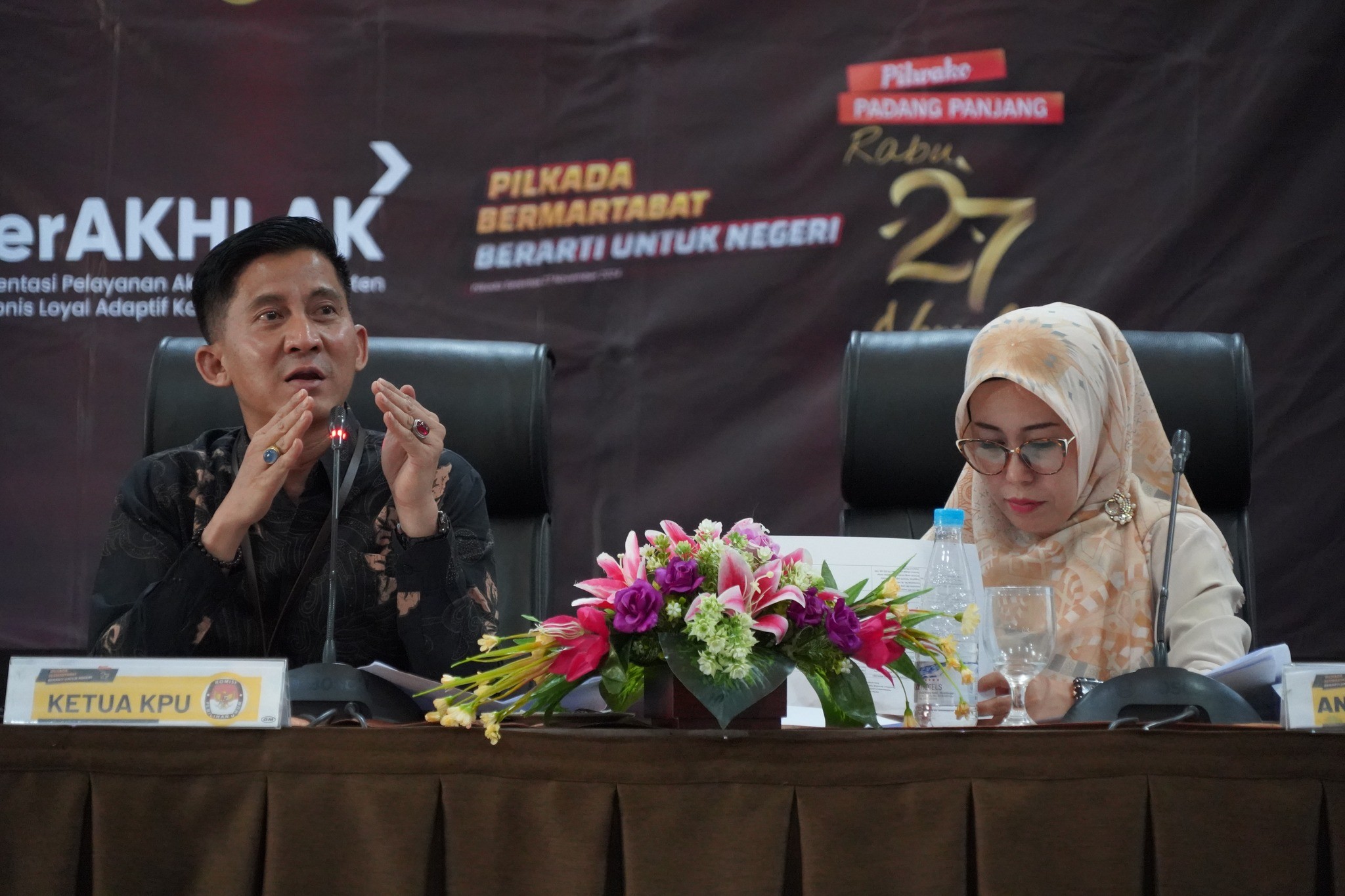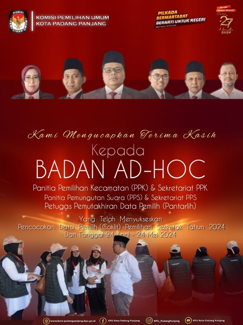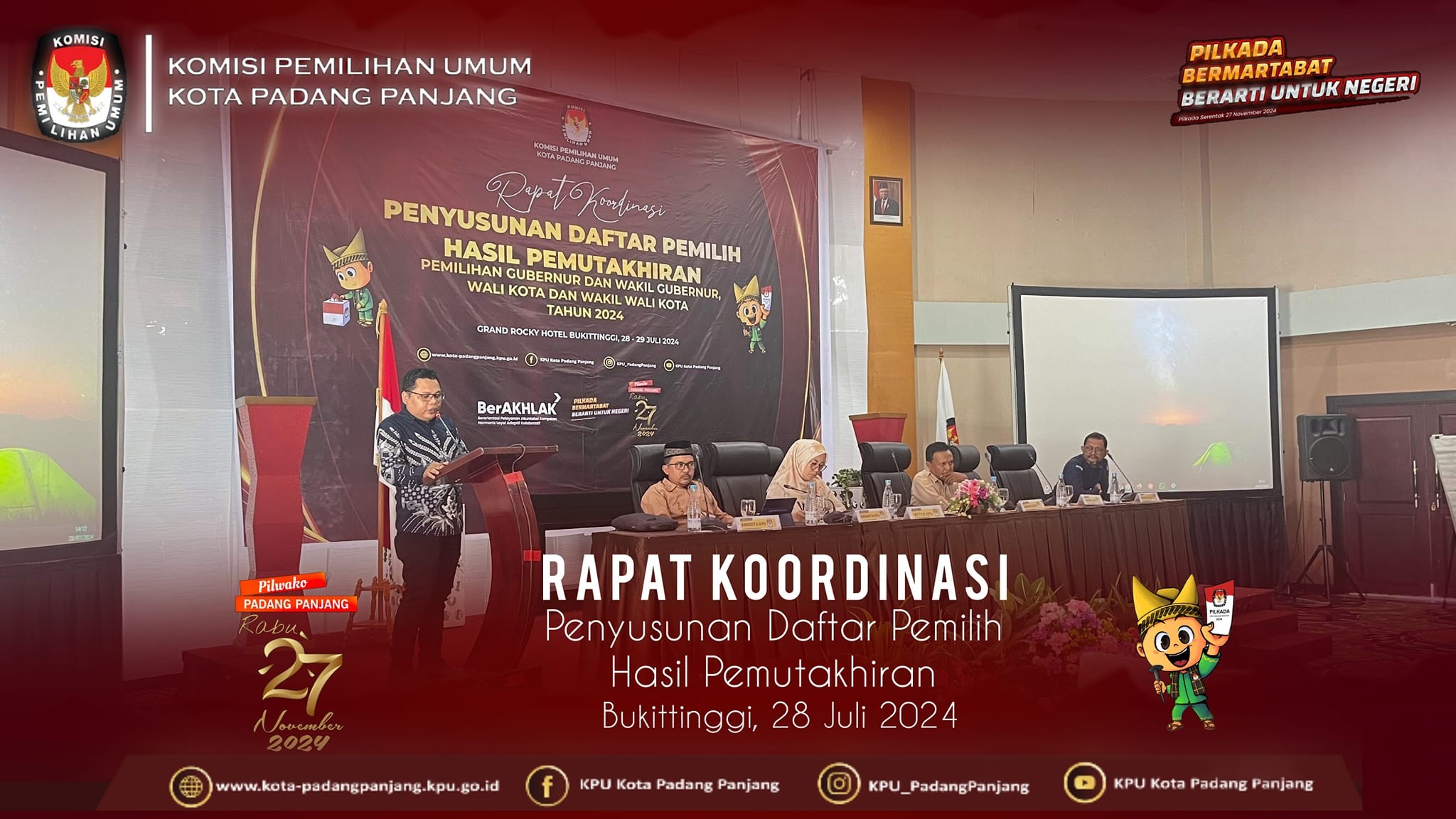 Mutakhirkan Daftar Pemilih, KPU Laksanakan Rapat Koordinasi Penyusunan Daftar Pemilih. Bukittinggi, Komisi Pemilihan Umum (KPU) Kota Padang Panjang melaksanakan rapat koordinasi penyusunan daftar pemilih hasil pemutakhiran pemilihan Gubernur dan Wakil Gunernur Provinsi Sumatera Barat dan Pemilihan Walikota dan Wakil Walikota Padang Panjang Tahun 2024 di Grand Rocky Hotel, 28-29 Juli 2024. Rapat koordinasi di buka oleh Puliandri Ketua KPU dan didampingi Anggota KPU Armen,SH., Dewi Aorora, SE., Masnaidi, S.Kom, M.A.P., dan Lucky Dharma Yuli Putra, M.Si Sekretaris KPU. Dihadiri oleh BPBD Kesbangpol, Disdukcapil, Panwaslu, PPK, PPS, dan Pantarlih Se-Kota Padang Panjang. Ketua KPU Padang Panjang dalam sambutannya menyampaikan Terimakasih kepada badan penyelengara AD-HOC atas apresiasi dan dedikasinya telah terlaksana dan menyelesaikan terselenggaranya pencocokan dan penelitian data pemilih (Coklit ). Teruntuk untuk PPK dan Sekretariat PPK, PPS dan Sekretariat PPS dan terkhusus buat Petugas Pemutakhiran Data Pemilih (Pantarlih) yang telah menyelesaikan Coklit 100% data pemilih pada Pemilihan Serentak Tahun 2024 di Kota Padang Panjang. Harapannya dengan adanya kegiatan ini data pemilih dapat terkelola dengan baik dan terdaftarnya semua masyarakat sebagai pemilih pada pemilihan nantinya. Selanjutnya nya Masnaidi Divisi Sosialisasi dan SDM menyampai terimakasih kepada Badan Penyelenggara ADHOC yang telah mensosialisasikan PSU, terkhusus Pantarlih dan KPPS yang sudah mensosialisasikan PSU ke rumah-rumah dan telah mengajak masyarakat untuk menggunakan hak pilih pada Pemungutan Suara Ulang (PSU) DPD tanggal 13 Juli kemaren. Selanjutnya Divisi hukum dan pengawasan Dewi Aorora, S.E., menyampaikan pentingnya pantarlih melalalui PPS untuk menyiapkan dan mengarsipkan administrasi dan dokumentasi selama pelaksanaan coklit. Karena data tersebut sewaktu - waktu dapat dipergunakan. Terakhir disampaikan Armen, SH., Divisi data dan informasi juga menyampaikan terima kasih kepada penyelenggara Adhoc atas telah terselesaikannya coklit data pemilih dalam tahapan pemutakhiran daftar pemilih.
