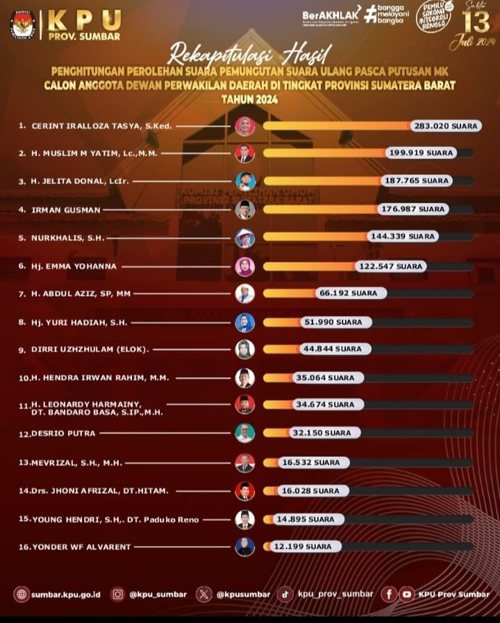 Hasil rekap ditetapkan oleh anggota KPU Provinsi Sumatera Barat divisi sosialisasi, Pendidikan pemilih, parmas dan SDM, Jons Manedi.