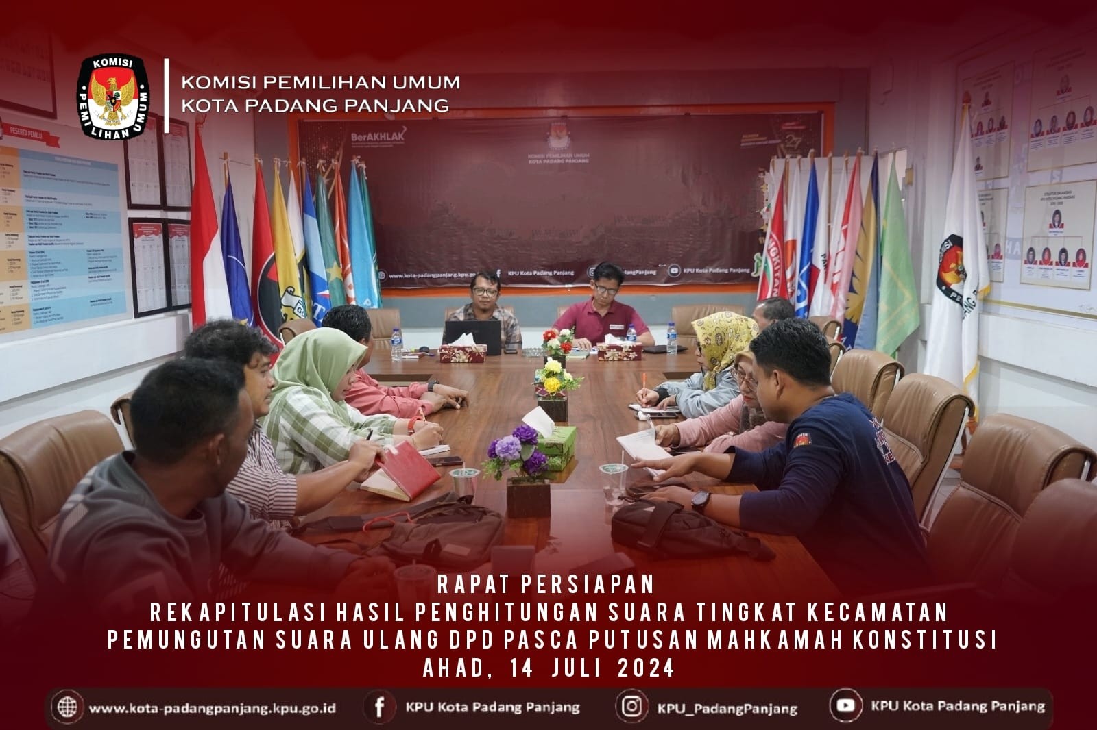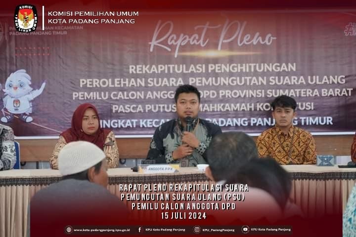 Padang Panjang, Panitia Pemilihan Kecamatan (PPK) Pemungutan Suara Ulang (PSU) Dewan Perwakilan Daerah (DPD) Provinsi Sumatera Barat melaksanakan rekapitilasi hasil penghitungan suara PSU di tinggakat kecamatan, Senin, 15/07/2024.