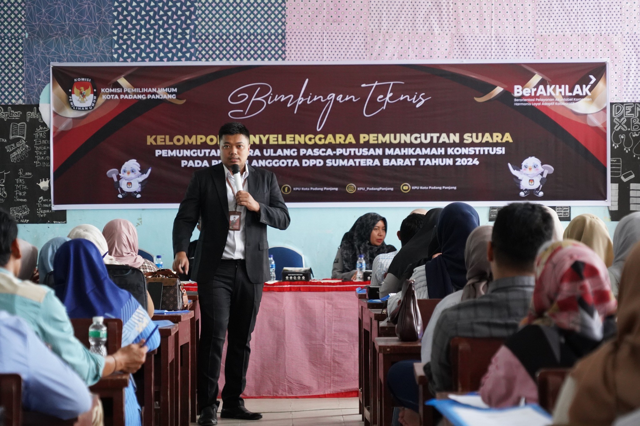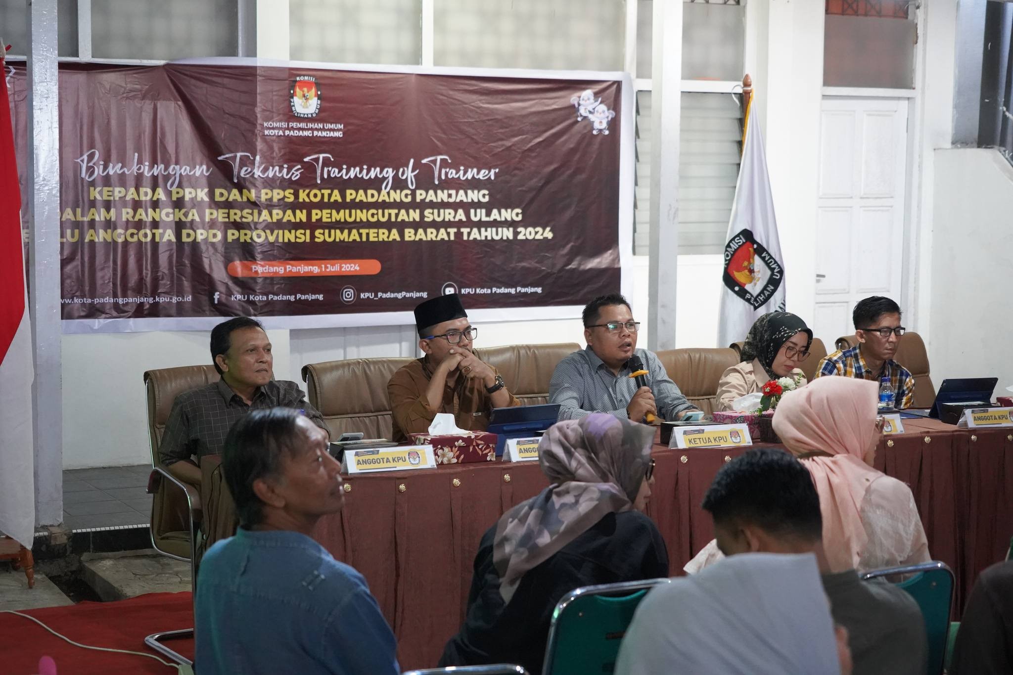 Padang Panjang, Komisi Pemilihan Umum (KPU) Kota Padang Panjang melaksanakan monitoring pelaksanaan bimbingan teknis tata cara pelaksanaan pemungutan suara ulang (PSU) Pemilihan Umum (pemilu) Calon Anggota Dewan Perwakilan Daerah (DPD) Republik Indonesia (RI) Daerah Pemilihan (dapil) Provinsi Sumatera Barat, Kamis, 04/07/2024.