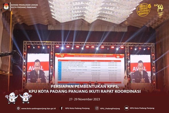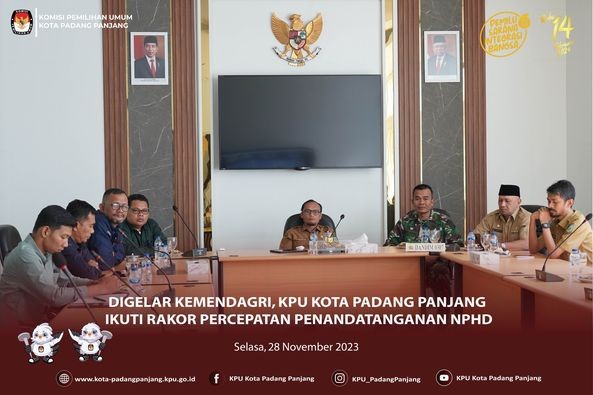 #Temanpemilih Ketua KPU kota Padang Panjang, Puliandri., Sekretaris, Lucky Dharma Yuli Putra beserta Kasubag KUL, Febriman mengikuti Rapat Koordinasi Percepatan Penandatanganan Naskah Perjanjian Hibah Daerah (NPHD) Pilkada tahun 2024 yang digelar oleh Kementerian Dalam Negeri, Selasa (28/11). Rakor yang dibuka dan dipimpin oleh Mendagri, Tito Karnavian tersebut dilaksanakan secara daring melalui aplikasi zoom meeting dan diikuti oleh Pemerintah Daerah, KPU, Bawaslu, TNI dan Polri se - Sumatera Barat. Bertempat di ruang rapat Balaikota Padang Panjang, hadir Pj. Sekda kota Padang Panjang, Winarno., Danramil 01/PP, Ibrahim, Ketua Bawaslu Padang Panjang, Hidayatul Fajri dan Kepala BPBD Kesbangpol, I Putu Venda. Mendagri menghimbau Pemerintah Daerah yang belum menandatangani NPHD agar segera melaksanakan tindakan tersebut. Selain itu, Mendagri juga mendorong Pemprov untuk aktif mendukung Pemerintah Daerah dalam menyelesaikan proses penandatanganan serta menetapkan besaran biaya yang dibutuhkan. Sebagai informasi, dari 19 kabupaten/kota di Sumatera Barat, 17 kabupaten/kota sudah melaksanakan penandatanganan NPHD antara KPU dan Pemerintah Daerah. (rts) #KPUMelayani #PemiluSerentak2024