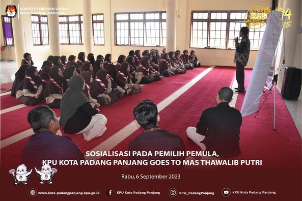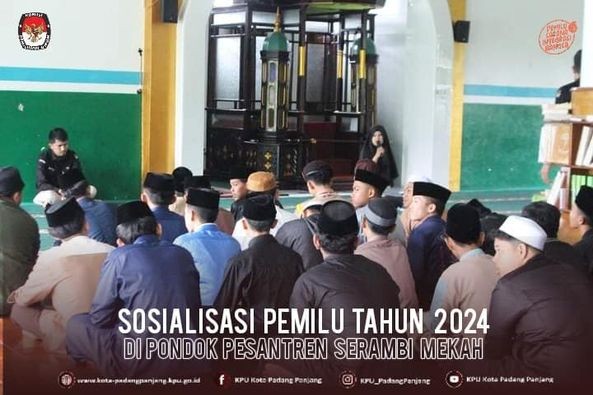 #Temanpemilih untuk pendidikan politik bagi pemilih pemula pada Pemilu 2024, KPU Kota Padang Panjang melaksanakan sosialisasi bagi pemilih pemula di MA dan SMA Pondok Pesantren Serambi Mekah. Dihadiri oleh santri yang didampingi oleh Kepala Sekolah dan Guru. Sebagai narasumber dari KPU Kota Padang Panjang Ir. Edwirta Divisi Hukum dan pengawasan KPU Kota Padang Panjang. Serta dihadiri oleh Tim Sosialisasi terdiri dari Kasubag Hukum SDM, Pejabat Fungsional dan Staf Sekretariat KPU Kota Padang Panjang. Edwirta mengajak santri untuk menggunakan hak pilih pada Pemilu 2024. Pemilu sebagai sarana pelaksanaan kedaulatan rakyat, yang dilaksanakan secara langsung, umum, bebas, rahasia, jujur dan adil . Melibatkan seluruh rakyat secara langsung bagi yang sudah memilki hak pilih. Dalam pemilu 2024 nanti akan memilih Presiden dan Wakil Presiden, Anggota DPR RI, DPD RI, DPRD Provinsi dan DPRD Kota/Kabupaten. Jadi ada lima jenis surat suara yang akan diterima pemilih pada saat pencoblosan tanggal 14 Februari 2024 nantinya. Selanjutnya bagi santri yang tinggal diasrama karena sudah terdaftar dalam daftar pemilih yang berada diluar daerah Kota Padang Panjang, jika rasanya tidak memungkinkan pulang ke daerah asal pada saat pemilihan nanti, satri sudah bisa mengurus pindah memilih dengan mengurus pindah memilih dari TPS asal terdaftar sebagai pemilih dan selanjutnya melapor ke TPS terdekat yang dituju di Kota Padang Panjang yang terdekat diasrama. Dipungujung kegiatan, Rizki Satria Pratama sebagai moderator tidak lupa menyampaikan terimakasih atas waktu yang diberikan oleh Pondok Pesantren Serambi Mekah dalam kegiatan sosialisasi untuk menyukseskan Pemilu 2024 dan diakhiri dengan foto bersama.