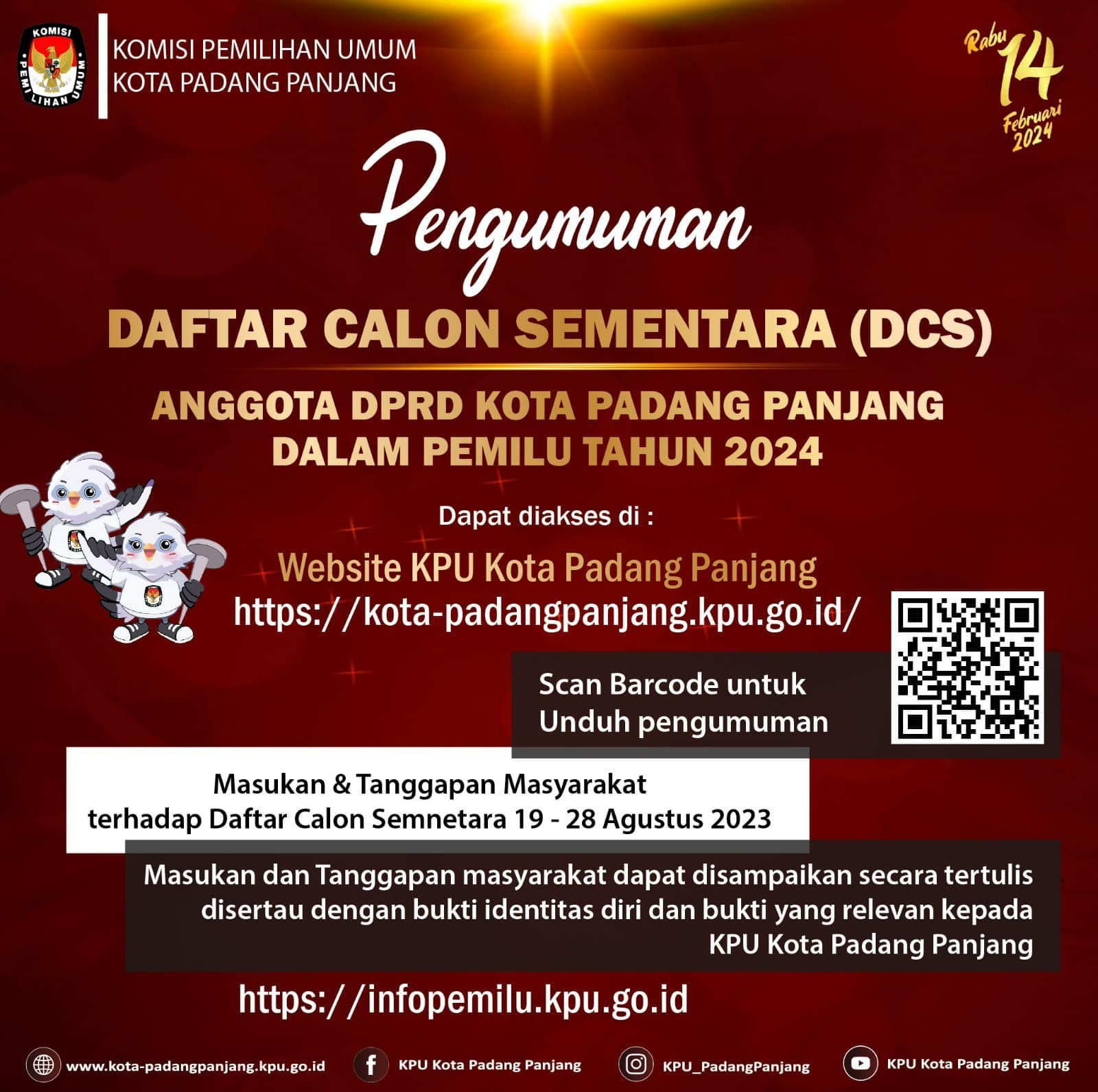 kota-padangpanjang.kpu.go.id. Komisi Pemilihan Umum (KPU) Kota Padang Panjang mengumumkan daftar calon sementara (DCS) Anggota Dewan Perwakilan Rakyat Daerah (DPRD) Kota Padang Panjang Pemilihan Umum (Pemilu) Serentak Tahun 2024,