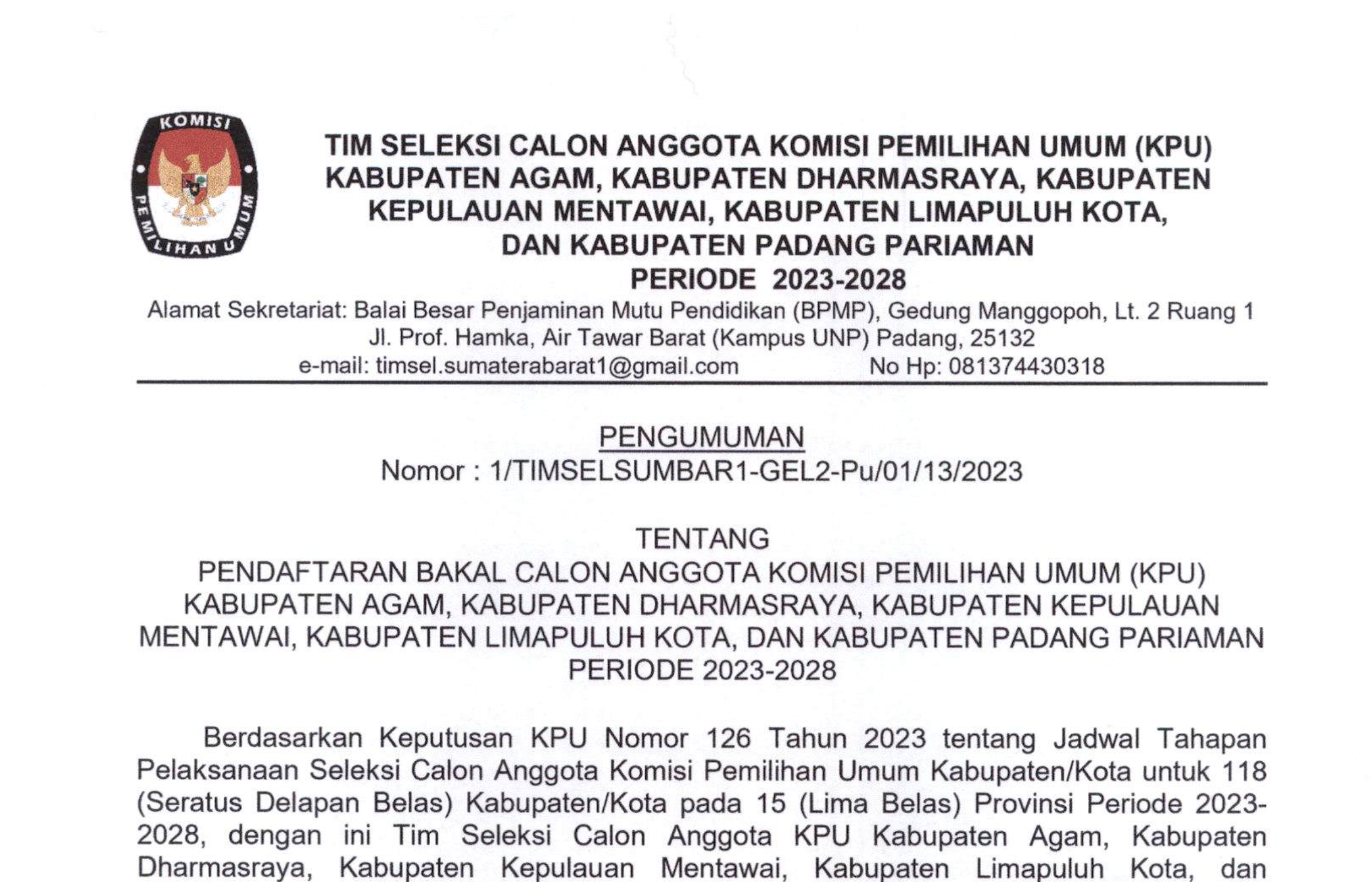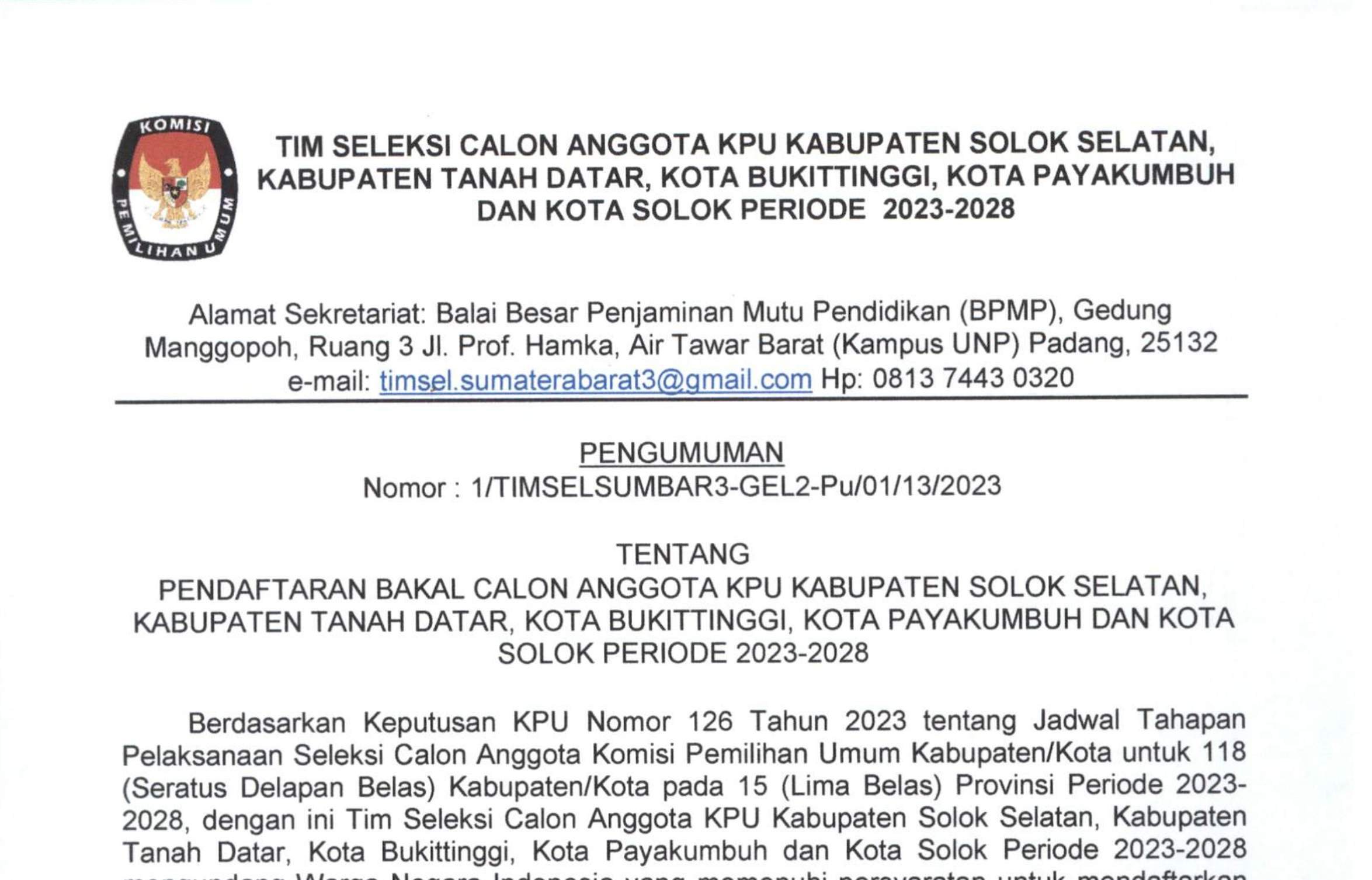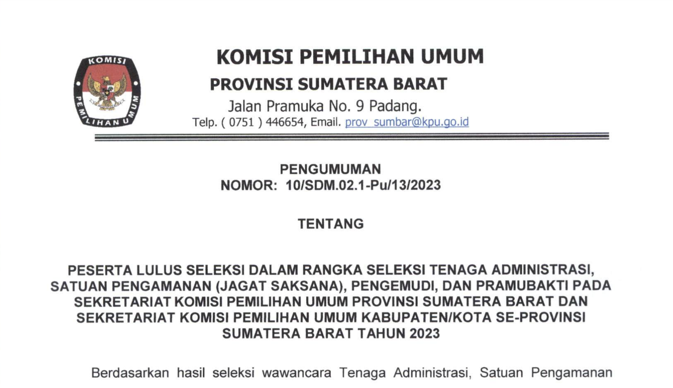 PENGUMUMAN NOMOR: 10/SDM.02.1-Pu/13/2023 TENTANG PESERTA LULUS SELEKSI TERTULIS DALAM RANGKA SELEKSI TENAGA ADMINISTRASI, SATUAN PENGAMANAN (JAGAT SAKSANA), PENGEMUDI, DAN PRAMUBAKTI PADA SEKRETARIAT KOMISI PEMILIHAN UMUM PROVINSI SUMATERA BARAT DAN SEKRETARIAT KOMISI PEMILIHAN UMUM KABUPATEN/KOTA SE-PROVINSI SUMATERA BARAT TAHUN 2023