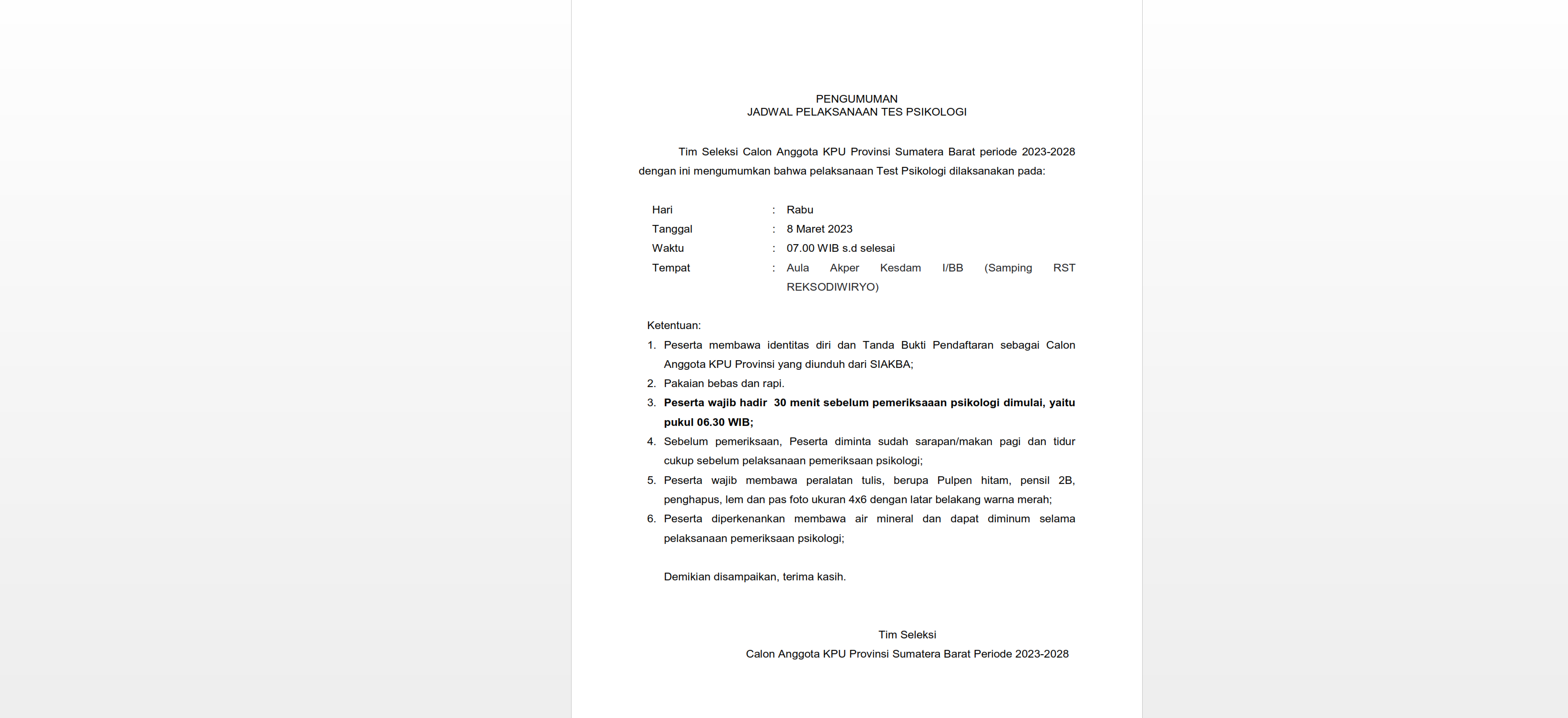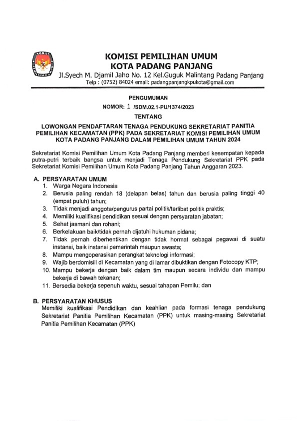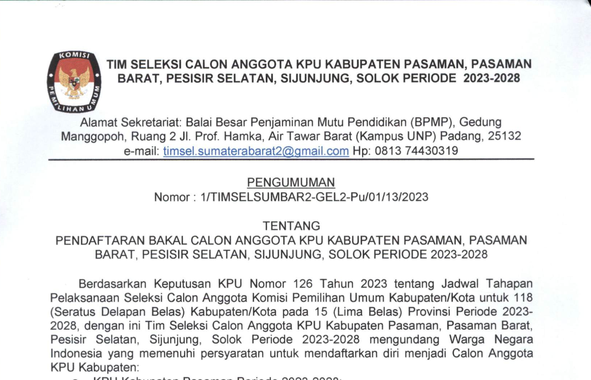 PENGUMUMAN NOMOR: 10/SDM.02.1-Pu/13/2023 TENTANG PESERTA LULUS SELEKSI TERTULIS DALAM RANGKA SELEKSI TENAGA ADMINISTRASI, SATUAN PENGAMANAN (JAGAT SAKSANA), PENGEMUDI, DAN PRAMUBAKTI PADA SEKRETARIAT KOMISI PEMILIHAN UMUM PROVINSI SUMATERA BARAT DAN SEKRETARIAT KOMISI PEMILIHAN UMUM KABUPATEN/KOTA SE-PROVINSI SUMATERA BARAT TAHUN 2023