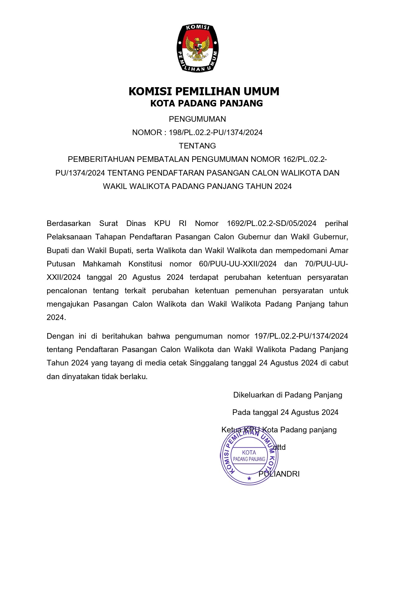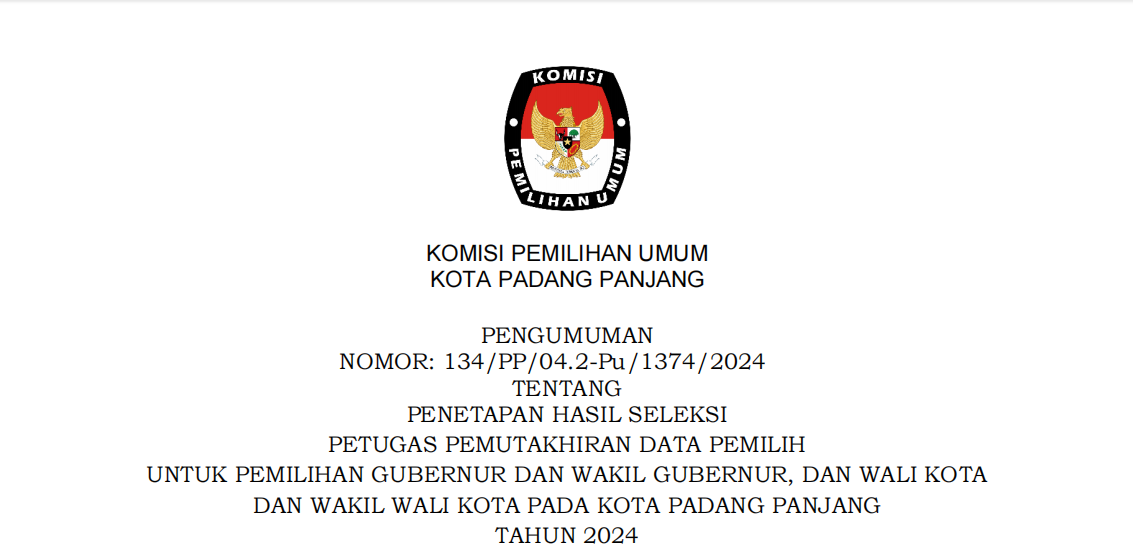 Berikut Pengumuman D.Hasil Kota Padang Panjang Pemungutan Suara Ulang Anggota DPD RI Tahun 2024 Download disini