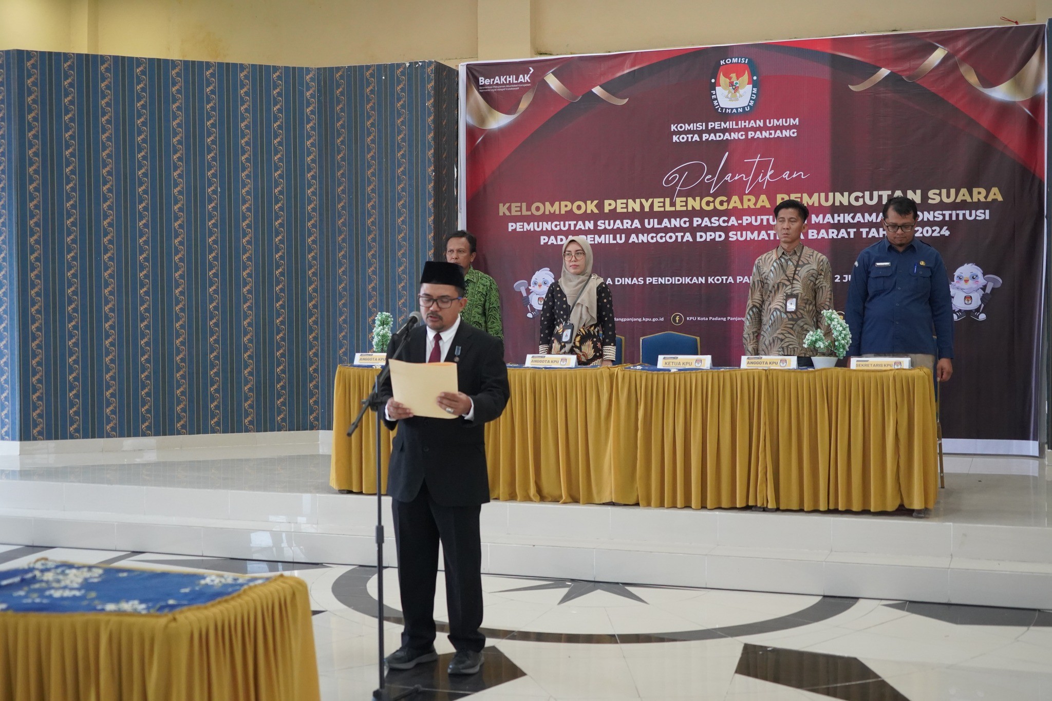 Komisi Pemilihan Umum (KPU) Kota Padang Panjang menggelar Rapat Pleno Rekapitulasi Perhitungan Perolehan Suara Tingkat Kota untuk Pemungutan Suara Ulang (PSU) Anggota DPD hasil putusan Mahkamah Konstitusi (MK) 2024, Rabu (17/7/2024) di Auditorium Mifan.