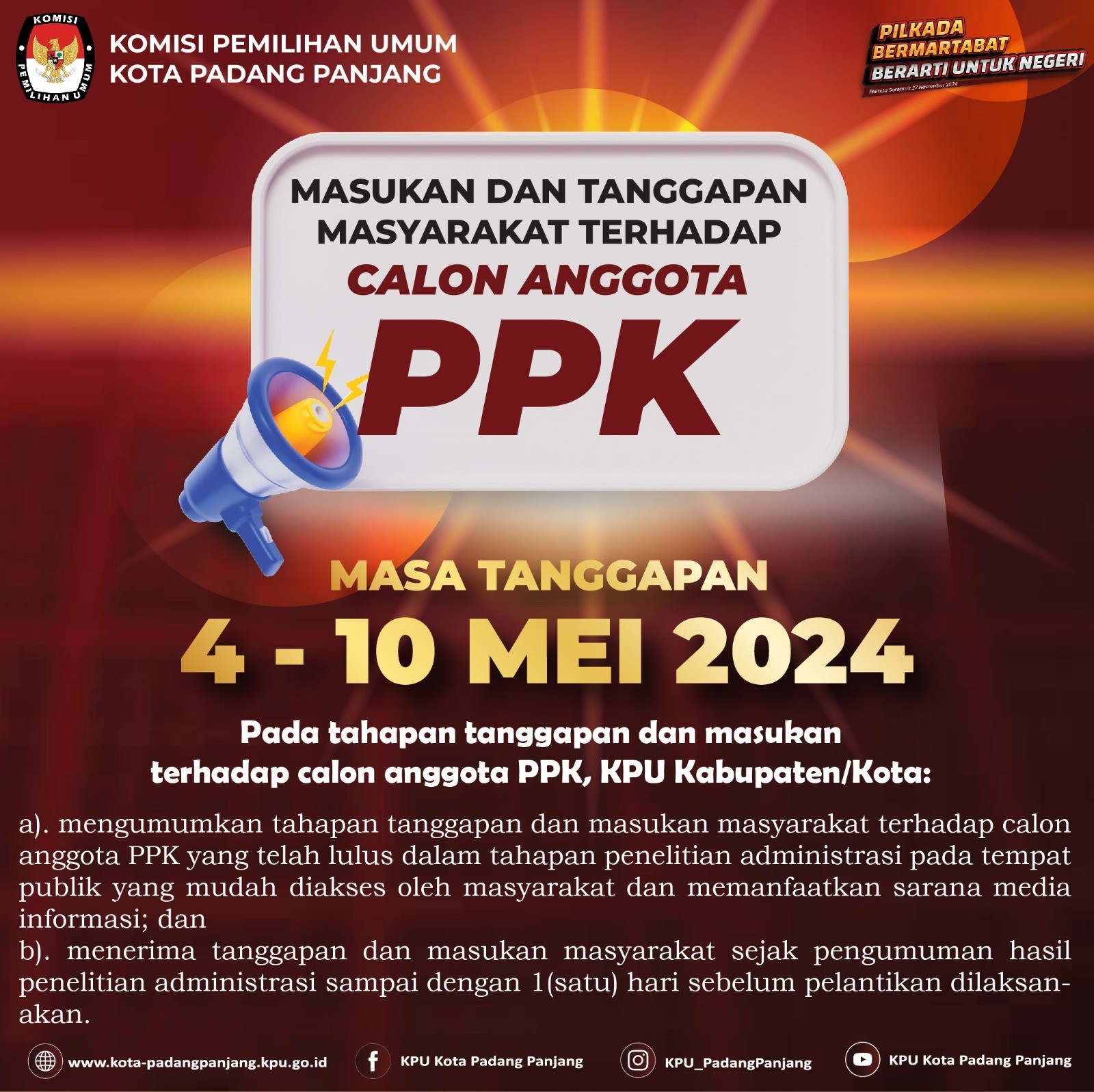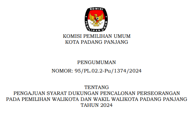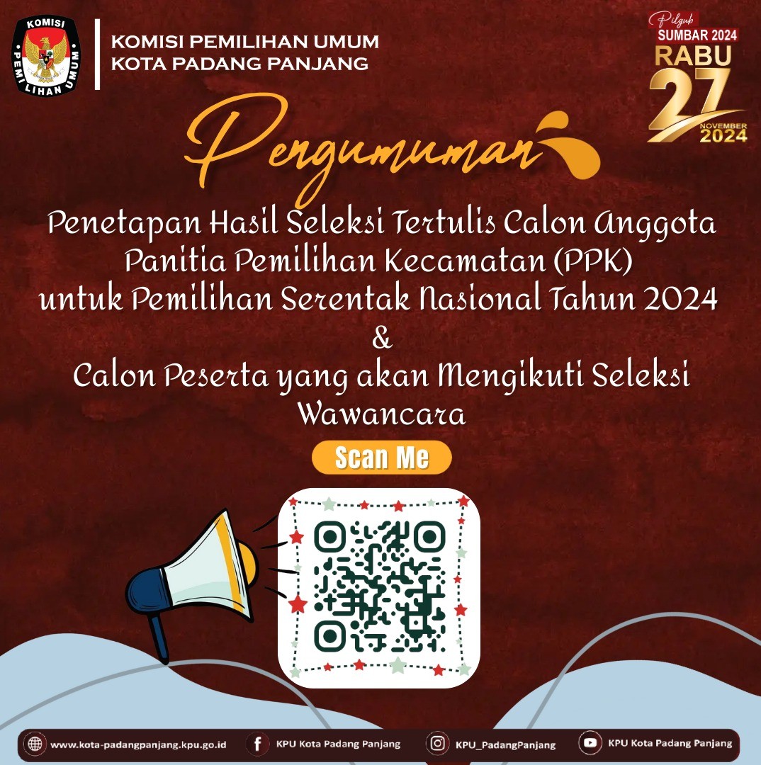 Sehubungan dengan telah ditetapkan Calon Terpilih Anggota Dewan Perwakilan Rakyat Daerah (DPRD) Kota Padang Panjang Pemilihan Umum Tahun 2024 pada tanggal 02 Mei 2024 di Auditorium Mifan Water Park Padang Panjang, dengan ini mengumumkan Hasil Keputusan Rapat Pleno Komisi Pemilihan Umum (KPU) Kota Padang Panjang Dalam Pemilu Serentak Tahun 2024 sebagai berikut :