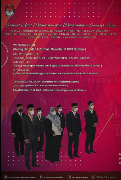 KPU Kota Padang Panjang mengucapkan Selamat atas Pelantikan dan Pengambilan Sumpah Janji Kepada : Sekretaris KPU Agam Oktadonis,S.Pd.,M.I.P, Sekretaris KPU Pasaman Barat Zaidi, SH dan Sekretaris Kabupaten Kepulauan Mentawai Irman Santoso, S.Kom, M.Si. Pejabat administrator di KPU Sumbar : Kabag. Teknis Penyelenggaraan Pemilu, Partisipasi dan Humas dijabat Sutrisno, SE., Kabag. Hukum dan SDM dijabat Aan Wuryanto, SH., Kabag. Keuangan, Umum dan Logistik dijabat Jumiati, S.IP, Kabag. Perencanaan, Data dan Informasi dijabat Wandrizen, SH. Dilantik di Aula Kantor KPU Sumatera Barat oleh Sekjen KPU Republik Indonesia Bernad Dermawan Sutrisno dengan melantik para pejabat administrator, pejabat pengawas, pejabat fungsional di Sekretariat Jenderal KPU RI, Sekretariat KPU provinsi maupun Sekretariat KPU kabupaten/kota se-Indonesia secara luring dan daring, dari kantor KPU RI di Jakarta, Rabu (5/1). Pelantikan tersebut juga diikuti oleh Komisioner KPU Kota Padang Panjang secara daring dari Aula Nova Indra KPU Kota Padang Panjang.