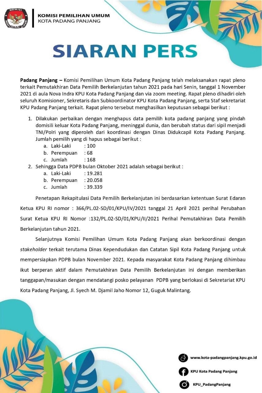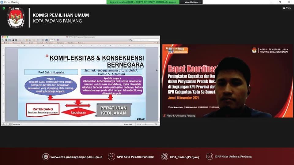 Dalam rangka mendukung pelaksanaan tugas dan fungsi pembinaan penyusunan Produk hukum/Keputusan di Lingkungan KPU Kota Padang Panjang, KPU Kota Padang Panjang Mengikuti Rapat Koordinasi Peningkatan Kapasitas dan kompetensi dalam Penyusunan Produk Hukum/Keputusan yang dilaksanakan pada 5 November 2021.