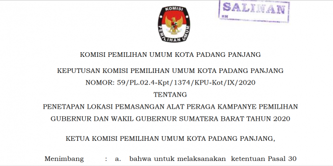 KEPUTUSAN KOMISI PEMILIHAN UMUM KOTA PADANG PANJANG TENTANG PENETAPAN LOKASI PEMASANGAN ALAT PERAGA KAMPANYE PEMILIHAN GUBERNUR DAN WAKIL GUBERNUR SUMATERA BARAT TAHUN 2020.